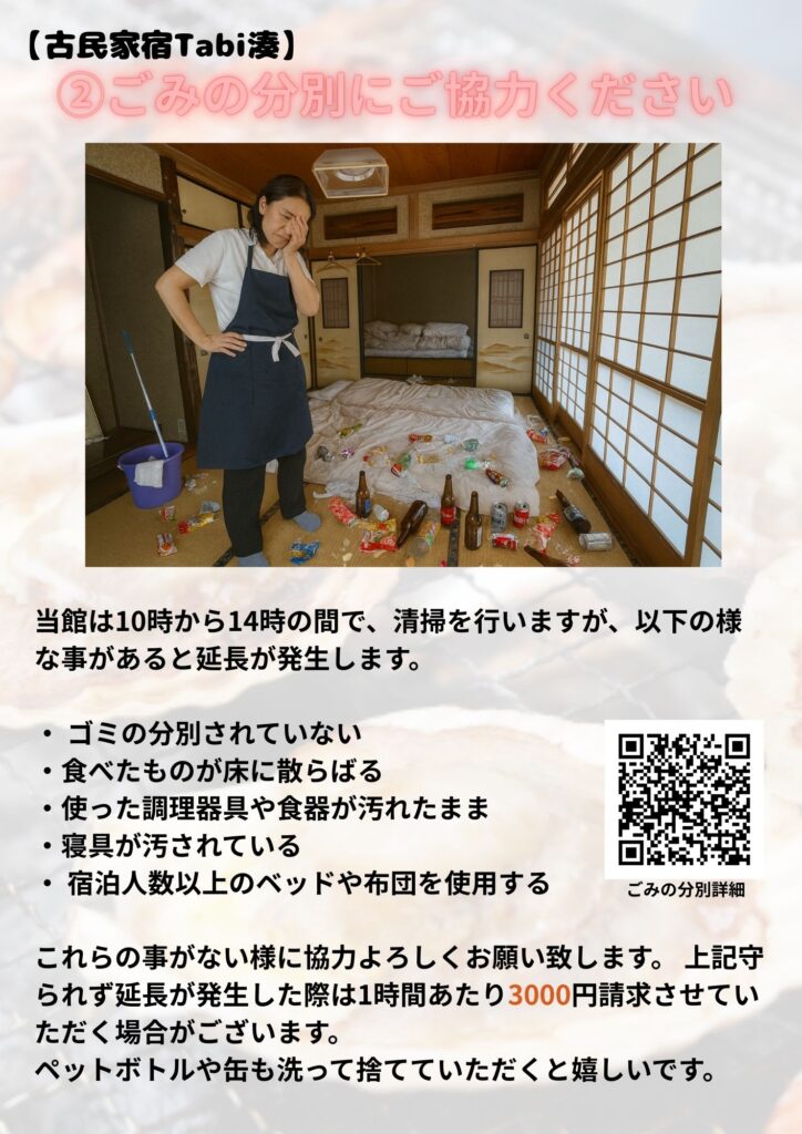 - ごみの分別: 指定の分別にご協力ください。床への散らかしや汚れがひどい場合は、清掃延長料が発生する場合がございます。
