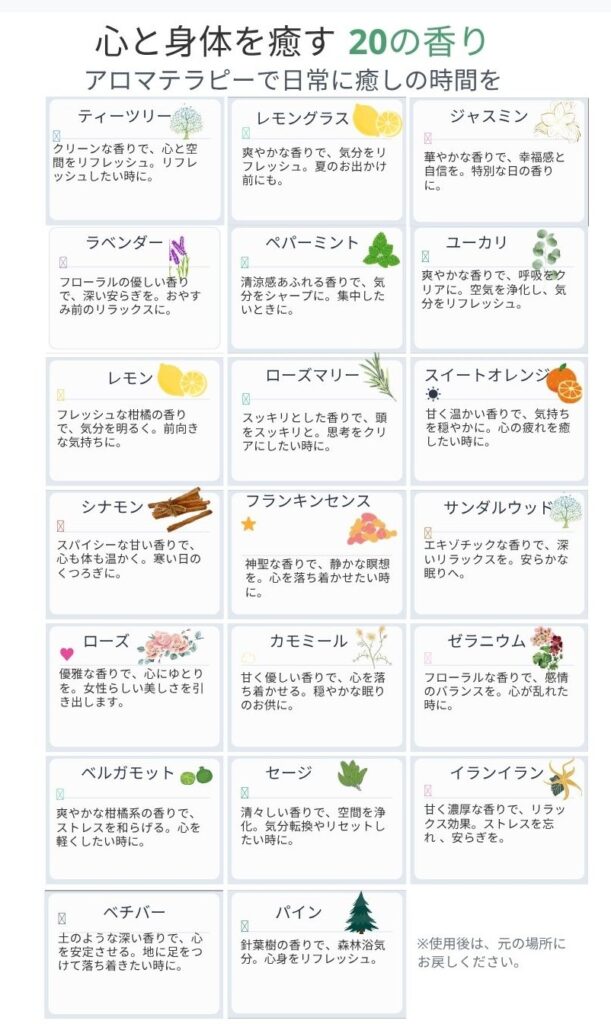 - お好きな香りを選べる: リラックス効果のあるラベンダー、気分をリフレッシュする柑橘系、森林浴のようなウッディな香りなど、その日の気分に合わせてお好きなアロマをお選びください。
