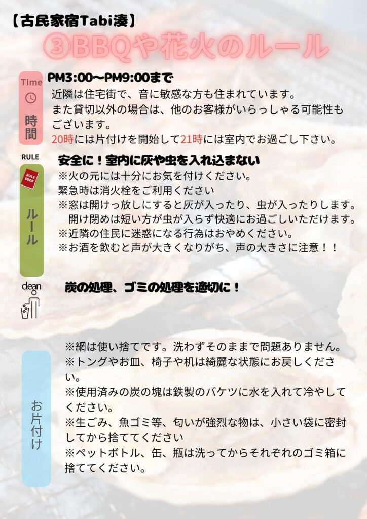BBQエリアは夜9時までのご利用となります。9時には片付けを開始して、10時には室内にてお楽しみください。